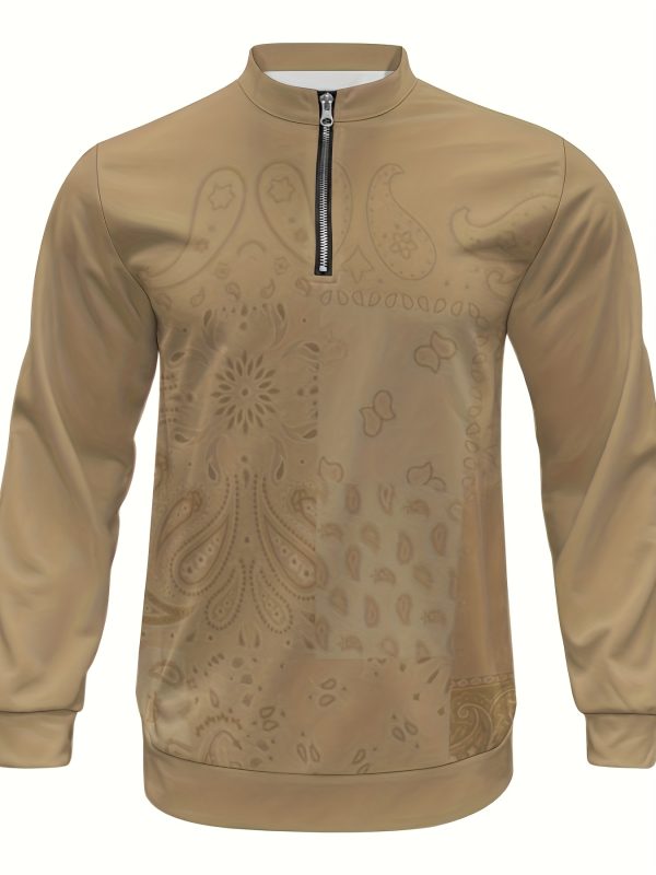 2025 Autumn New Khaki Paisley Pattern Men’s Casual Sportswear Set, Fashionable Men’s Casual Half-Zip Pullover Long Sleeve T-Shirt + Comfortable Sports Long Pants, Suitable for Daily, Sports, Walking