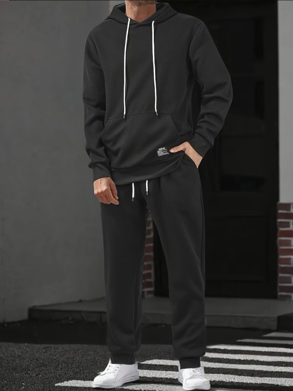 2pcs Men’s Heavyweight Waffle Knit Thermal Hooded Sweatsuit Set – Oversized Hoodie & Jogger Pants, Thick Winter Warmth, Casual Solid Black Tracksuit, Comfortable Matching Outfit for Fall and Winter Layering, Long Sleeve Drawstring Pants with Pockets, Relaxed Fit for Casual Attire