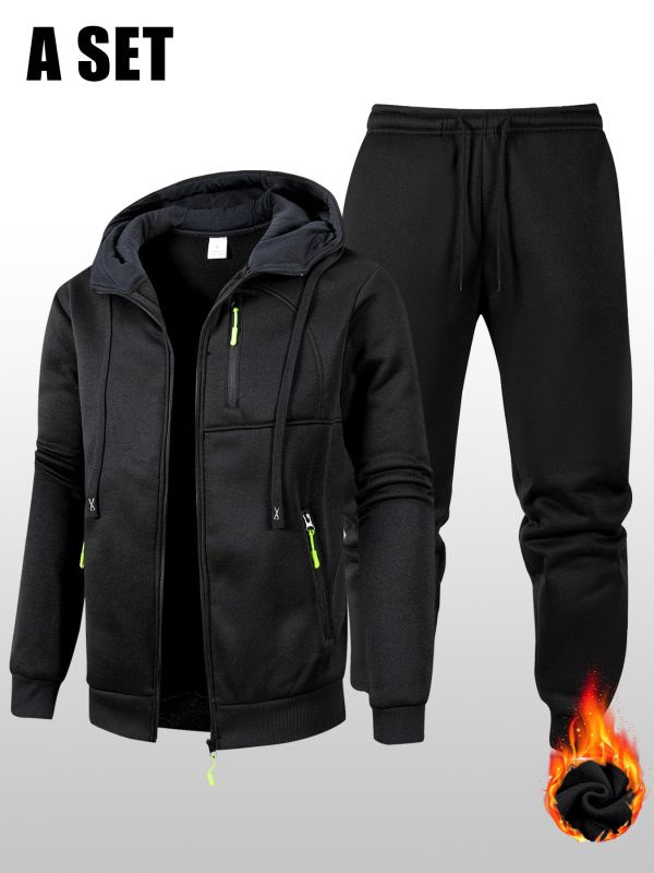 1 Set Men’S Fleece Multi-Pocket Hooded Jacket Sweatshirt and Jogger Pants Outfit Solid Color Fleece Patchwork Hooded Zip-Up Cardigan Thickened Fleece Drawstring Long Pants Set 2pcs Zipper Contrast Design Hooded Sweatshirt with Drawstring XX Letter Design Pants with Drawstring Pockets Suitable for Daily Casual, Outdoor Sports, Fitness, Travel, Hiking, etc