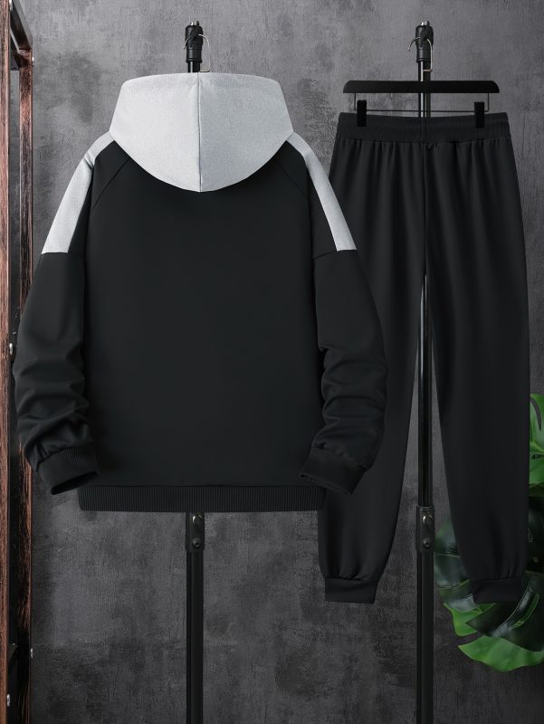 1set Men’S Sports Hooded Jacket and Joggers Set, Polyester Knit Fabric with Slight Stretch, Patchwork Design, Regular Fit, Springu002FFall Season, with Pockets