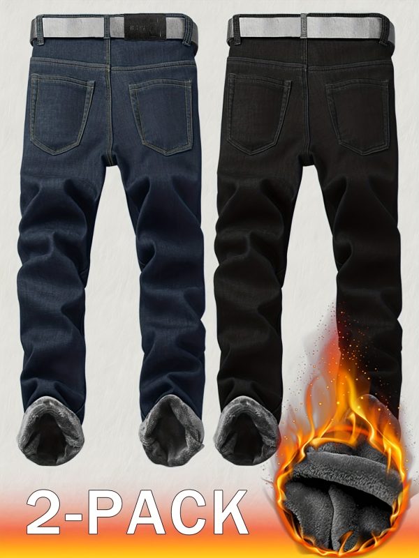 2-Pack Men’S Slim Fit Fleece-Lined Thermal Faux Denim – Winter Warmth with Elastic Comfort Waist & Minimalist Design, Solid Black & Blue Faux Denim for Casual & Formal Wear, Versatile Everyday Pants (No Bulk, Durable Fleece Lining), Cold Weather Clothing, Seasonal Fashion, Modern Menswear, Stylish Trousers, Highquality Stitching, Comfortable Waistband, Warm Trousers, Men Jean, Designer Jean Men, Jean Pant For Men, Men Pant