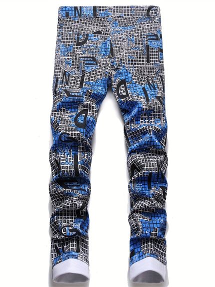 Men’S Slim-Fit Stretch Denim Jeans with Unique Digital Print Design – Mid-Rise, Cotton Blend, Street Style Casual Pants in Blue & Black Grid Pattern, Street Style Jeans | Modern Casual Jeans | Zipper Detail Pants