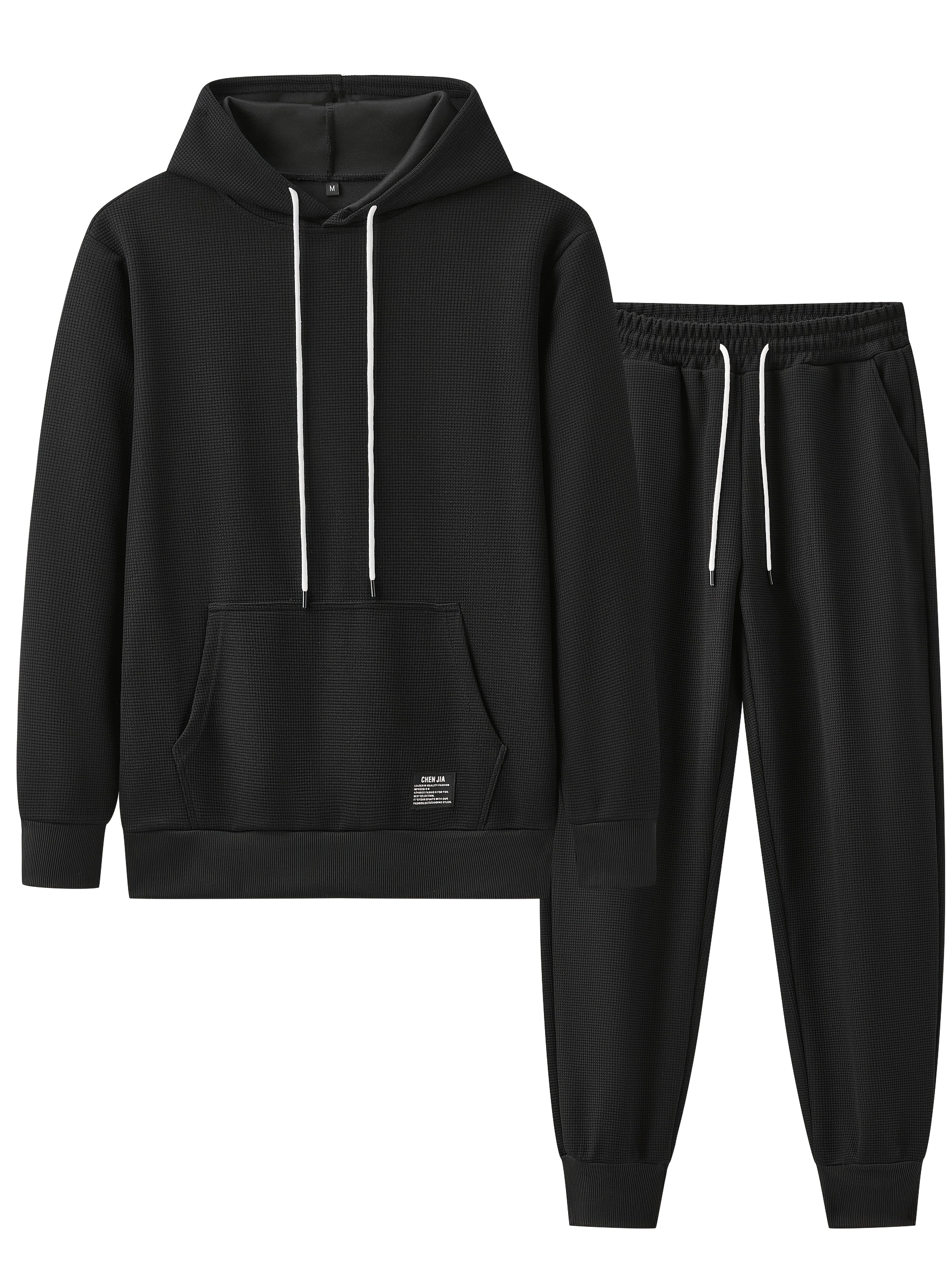 2pcs Men’s Heavyweight Waffle Knit Thermal Hooded Sweatsuit Set – Oversized Hoodie & Jogger Pants, Thick Winter Warmth, Casual Solid Black Tracksuit, Comfortable Matching Outfit for Fall and Winter Layering, Long Sleeve Drawstring Pants with Pockets, Relaxed Fit for Casual Attire