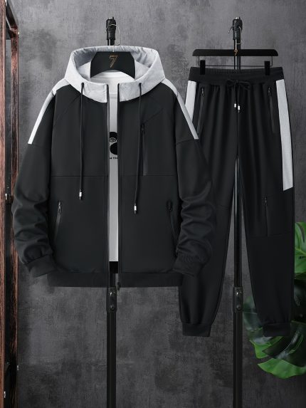 1set Men’S Sports Hooded Jacket and Joggers Set, Polyester Knit Fabric with Slight Stretch, Patchwork Design, Regular Fit, Springu002FFall Season, with Pockets