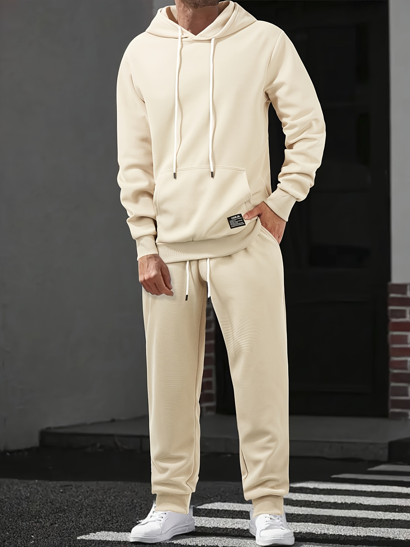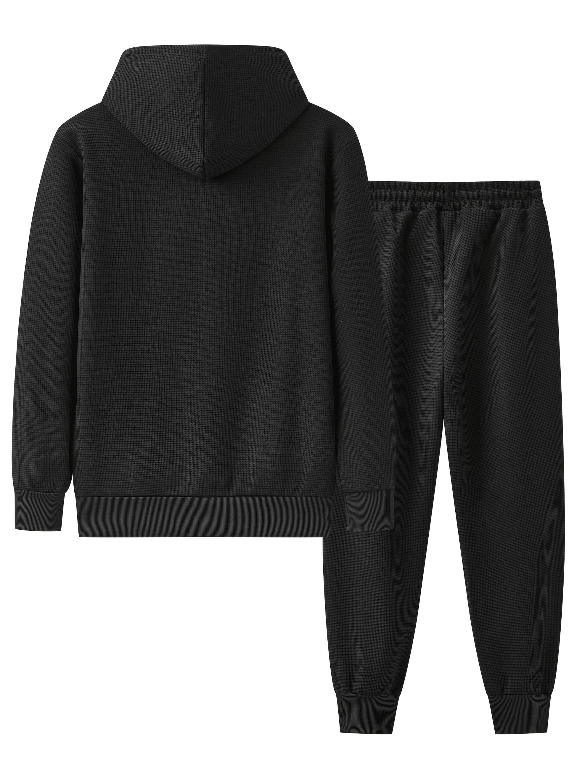 2pcs Men’s Heavyweight Waffle Knit Thermal Hooded Sweatsuit Set – Oversized Hoodie & Jogger Pants, Thick Winter Warmth, Casual Solid Black Tracksuit, Comfortable Matching Outfit for Fall and Winter Layering, Long Sleeve Drawstring Pants with Pockets, Relaxed Fit for Casual Attire