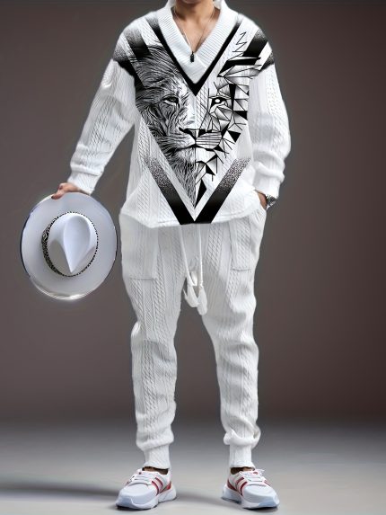 Men’s Casual Pants Set Star Flourish OBM Amazon Cross-border New European and American Men’s Casual Pants V-neck Fashion Printed Jacquard Sweater Autumn and Winter Set