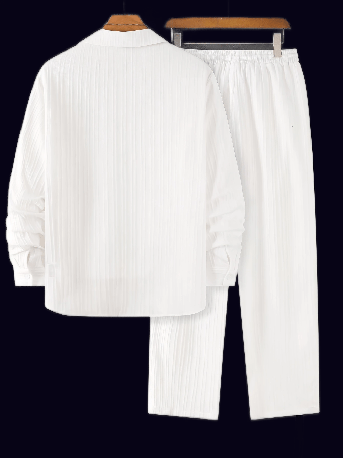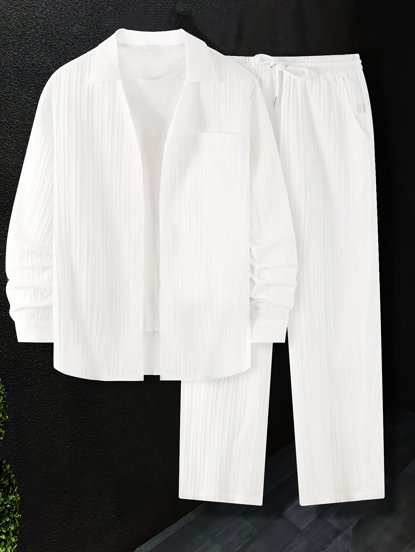 Elegant Shirt Set Casual Elegant Men’s Striped Texture Button-Up Shirt and Pants Set – Polyester, Long Sleeve, Button Detail, Ideal for Springu002FFall