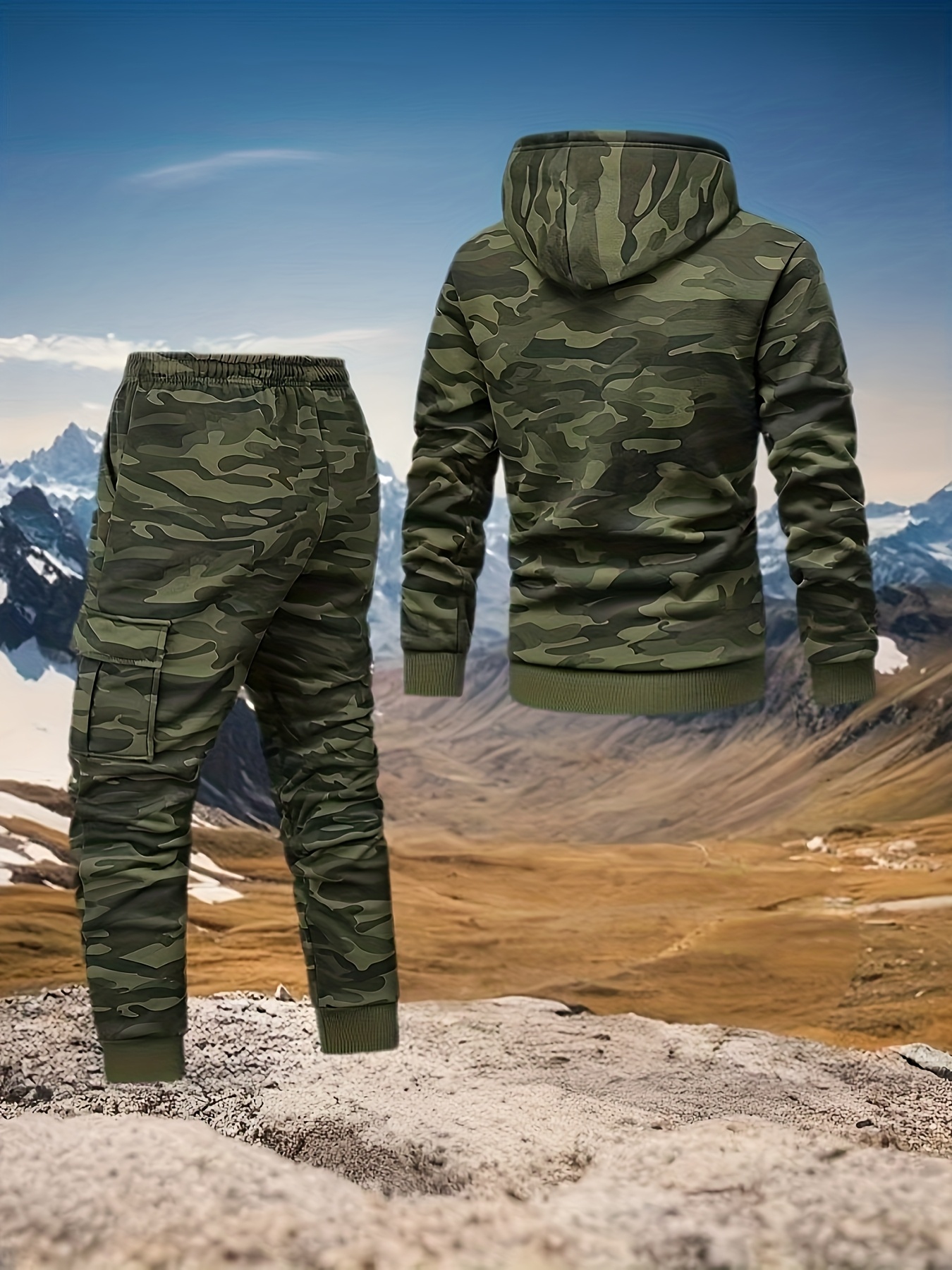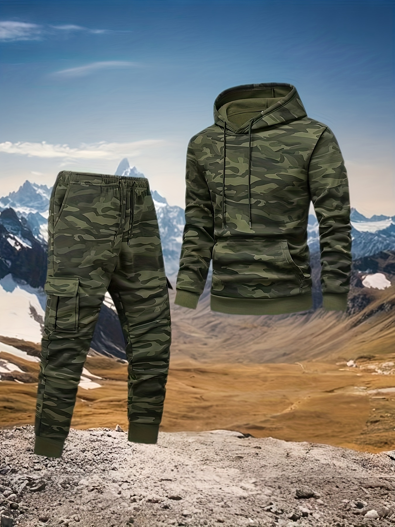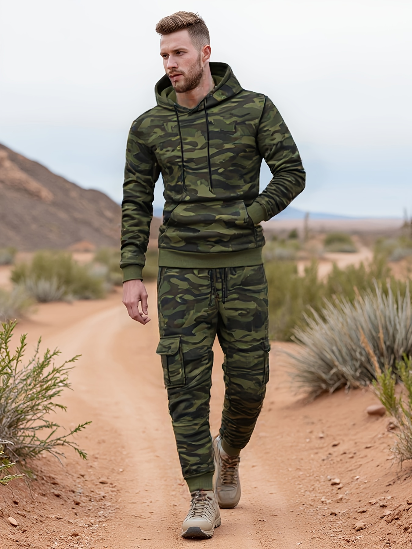 Home Men's Sets Men’S Camo Hooded Sweatshirt & Pants Set – Olive Green & Camouflage, Long Sleeve, Non-Stretch Fabric, Casual Outdoor Wear, Springu002FFall Collection, Casual Outdoor Wear | Camouflage Pattern | Nonstretch Fabric