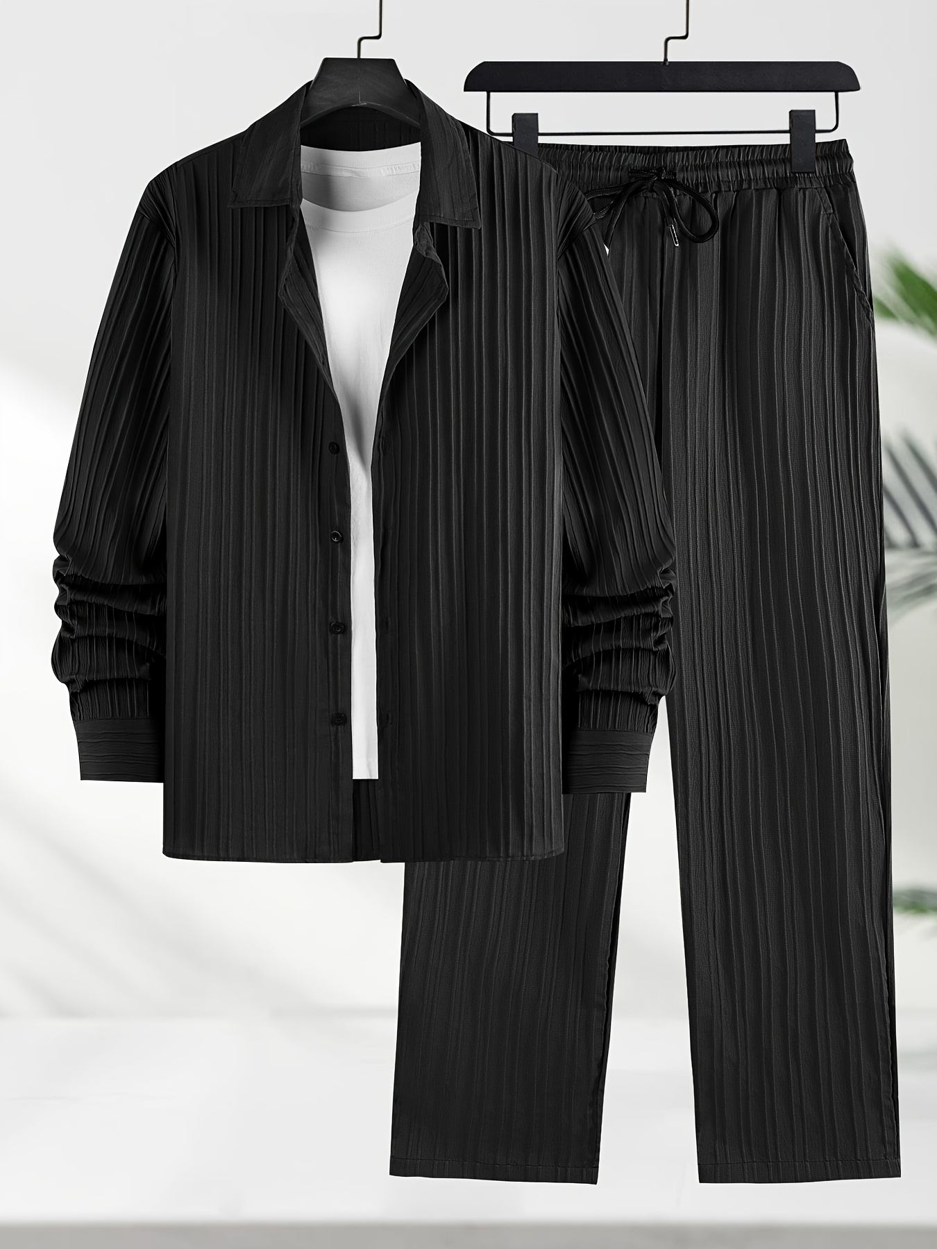 Men’s Long Sleeve Shirt and Pants 2pcs Set, Wavy Stripe Texture Long Sleeve Shirt with Lapel Button-Up Top and Trousers, Casual Solid Color Outfit
