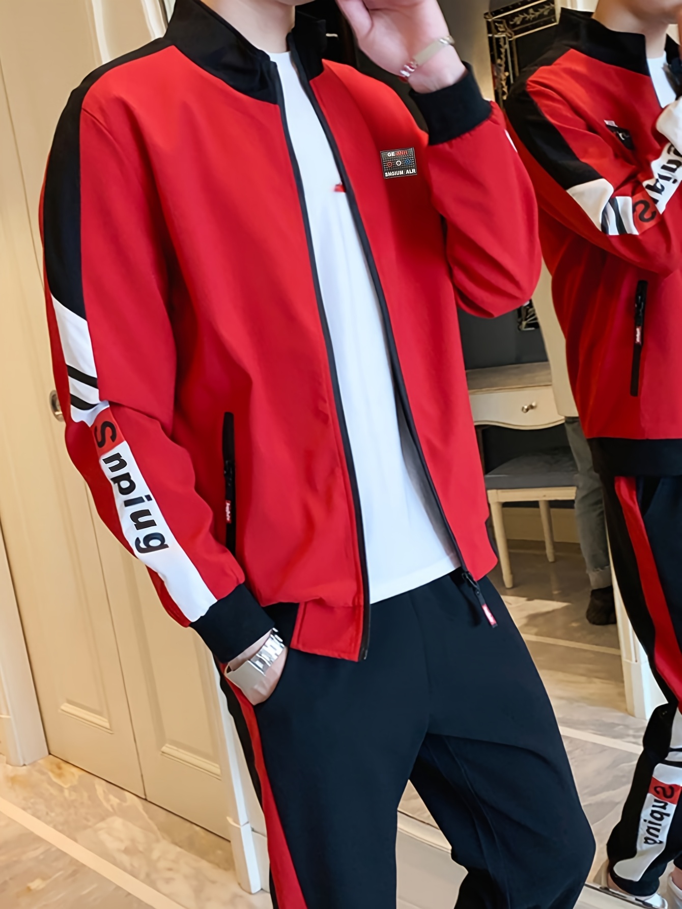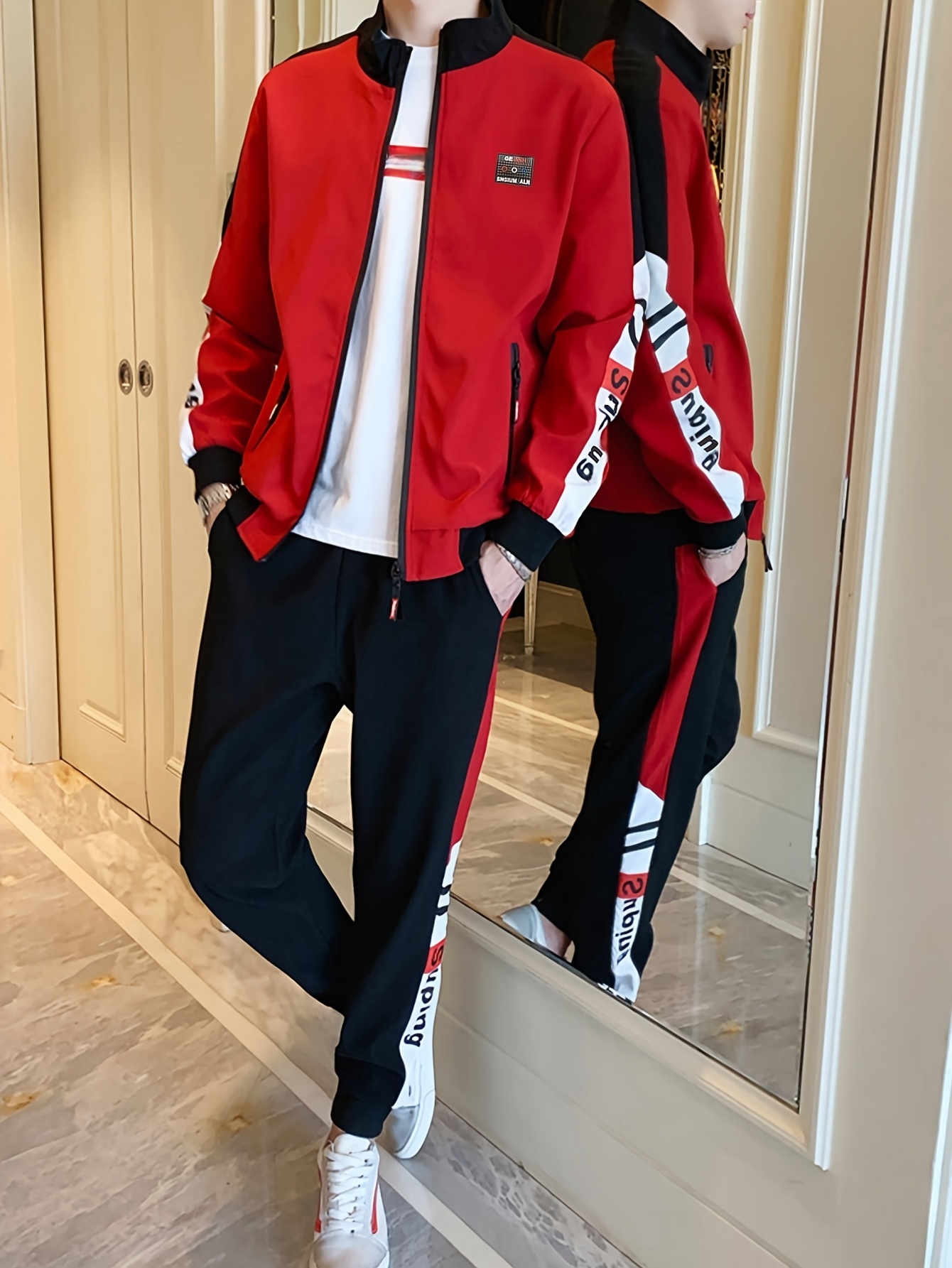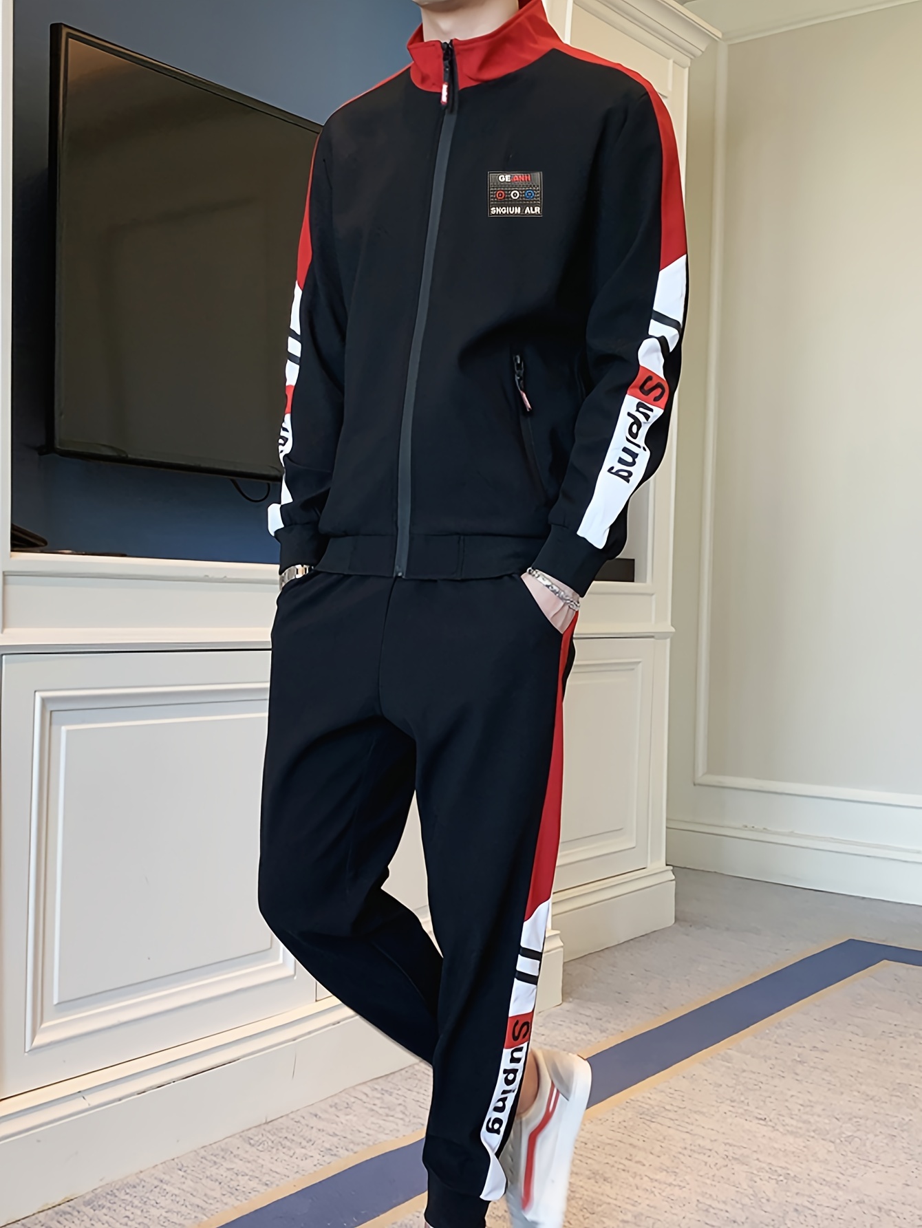 Home Men's Sets Men’S Slim-Fit Casual Sportswear Set – Trendy Stand Collar Zip-Up Jacket & Joggers with Color Block Design, Long Sleeves, and Pockets for Springu002FFall, Perfect for Outdoor Activities, Casual Wear|Modern Casualwear|Zippered Jacket