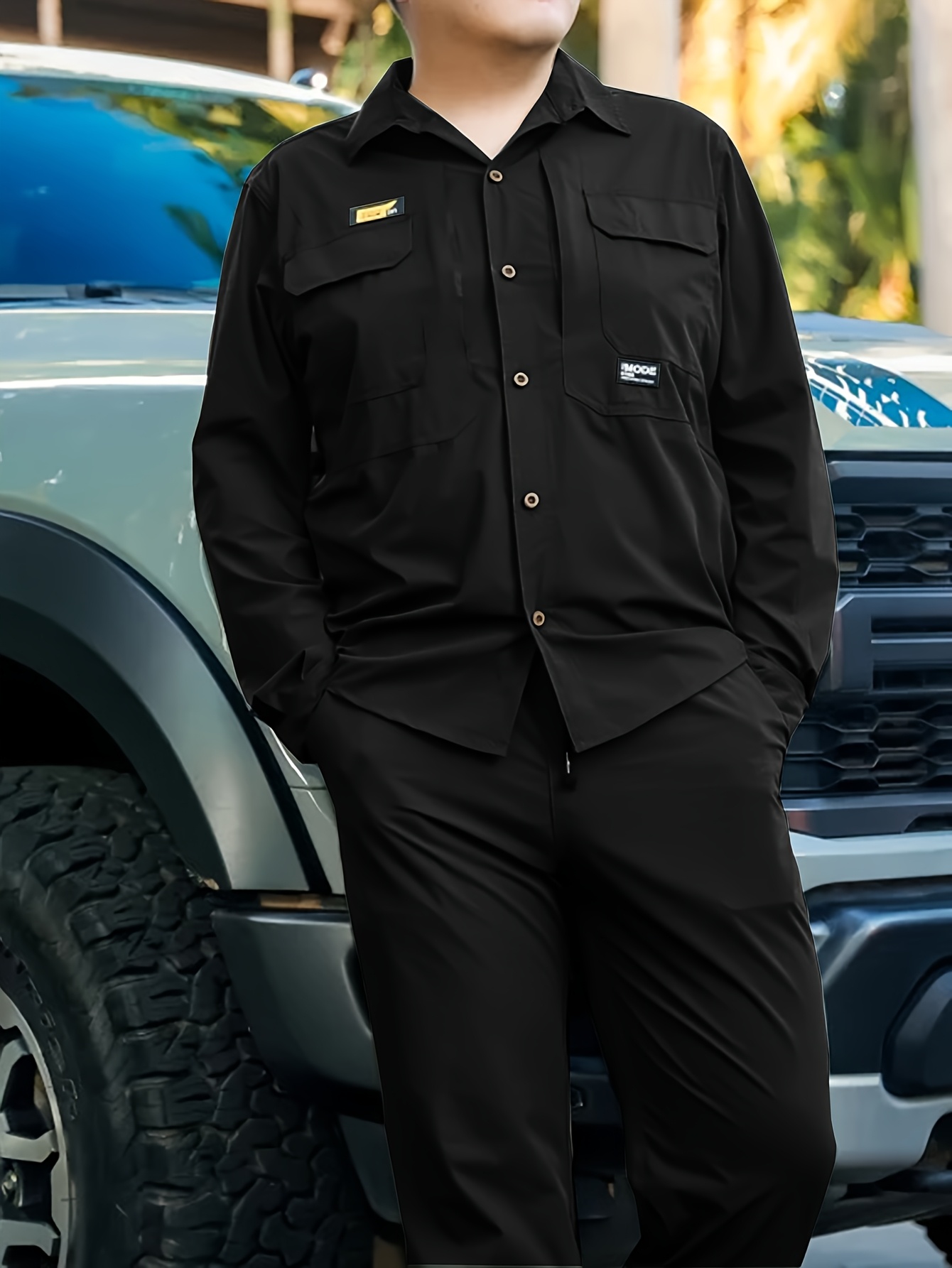 Men’S Two-Piece Casual Outfit – Black Button-Up Shirt & Pants, Long Sleeve, Loose Fit, Non-Stretch Fabric, Perfect for Springu002FFall, Casual Attire|Relaxed Fit|Buttonup Shirt