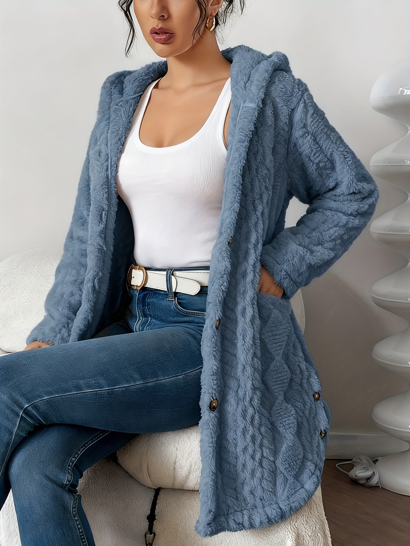 Home Women's Athleisure Women’s Thick Winter Cardigan Coat – Hooded Collar Longline Teddy Sweater Jacket with Button Front & Pockets, Machine Washable Solid Color Warm Outerwear for Fall and Winter (No, Casual to Formal)