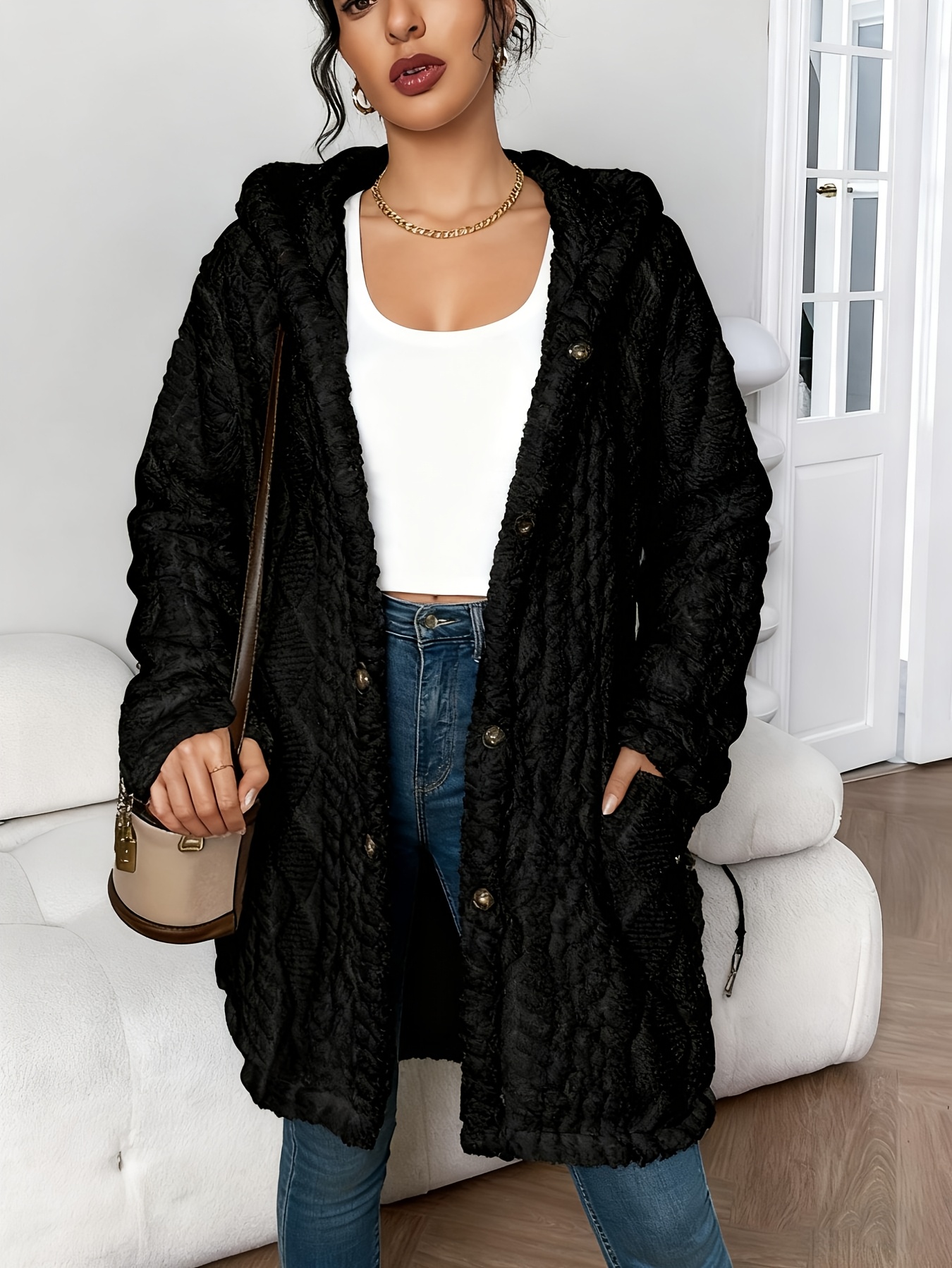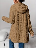 Women’s Thick Winter Cardigan Coat – Hooded Collar Longline Teddy Sweater Jacket with Button Front & Pockets, Machine Washable Solid Color Warm Outerwear for Fall and Winter (No, Casual to Formal)