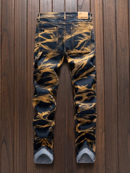 Men’S Slim-Fit Straight-Leg Motorcycle-Inspired Faux Denim – Black & Yellow Tie-Dye Street Style with Golden Marbled Pattern, All-Season Versatile Casual Pants, Built-In Zipper Closure & No Bulk Design for Urban Outfits (Machine-Washable), Pants For Men, Faux Denim For Men